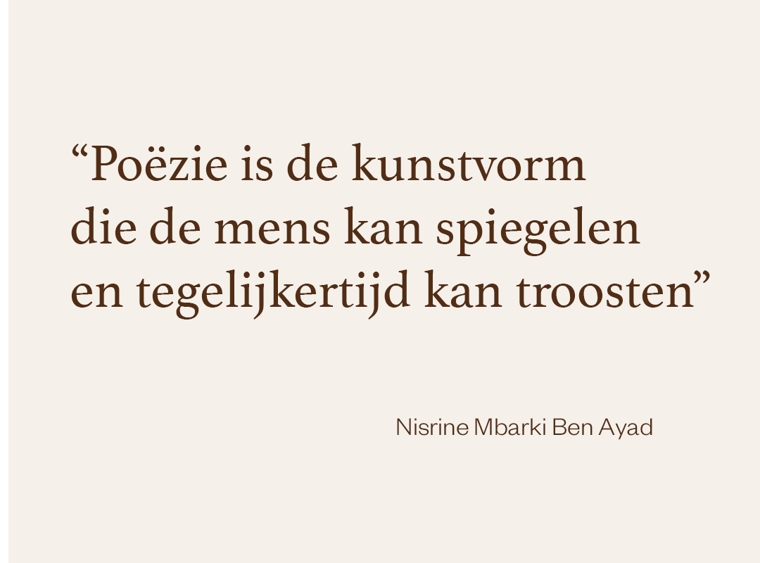 “Poëzie is de kunstvorm die de mens kan spiegelen en tegelijkertijd kan troosten”. Ik las deze quote in een interview met de nieuwe dichter des vaderslands Nisrine Mbarki Ben Ayad. Zo mooi en waar.